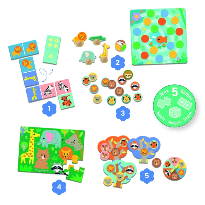 Djeca će uživati u memoryju, lottou, dominama, puzzlama (12 dijelova) i igri s bacanjem kocke, razvijajući pritom logičko razmišljanje, pamćenje i opažanje. Ovaj komplet nudi raznovrsnu zabavu sa slatkim životinjama iz savane i pruža sate igre za cijelu obitelj. Sve igre izrađene su od FSC® certificiranog papira i kartona, za sigurno i održivo igranje.