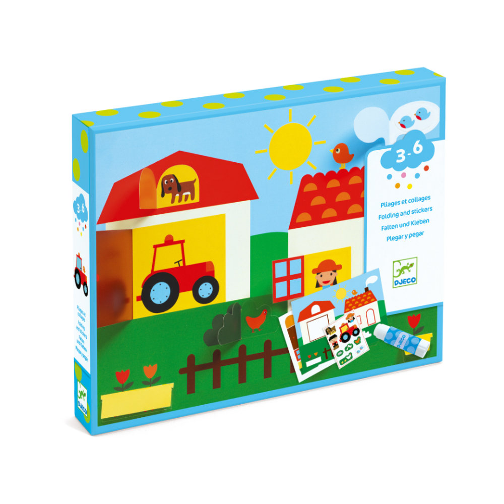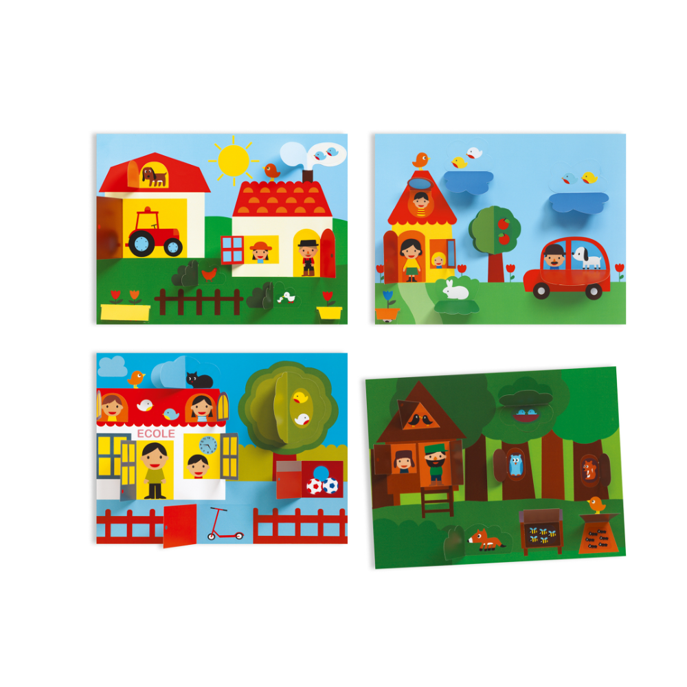 Set sadrži 4 kartice sa sklopivim dijelovima slike, naljepnice, ljepilo i knjižicu s uputama.