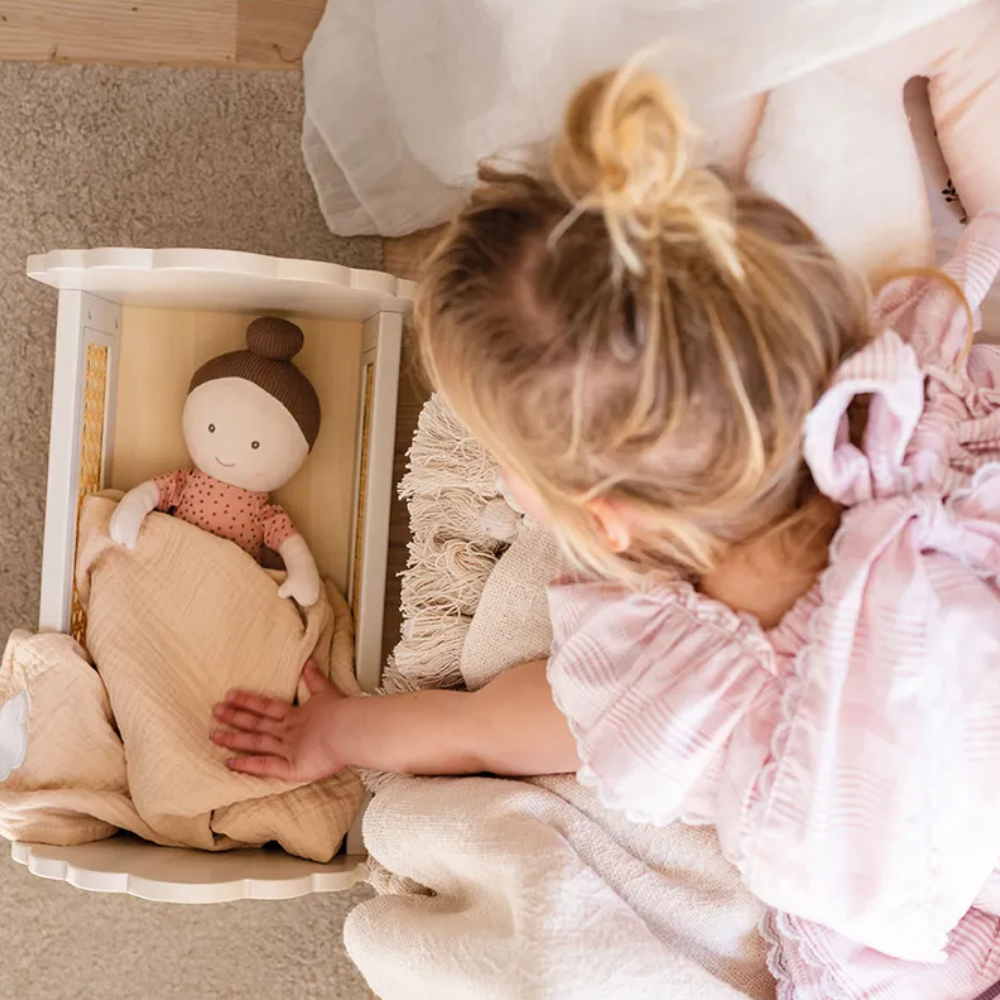 Jabadabado kolijevka za lutke ima predivnu krem boju i ukrasne detalje poput ratana.