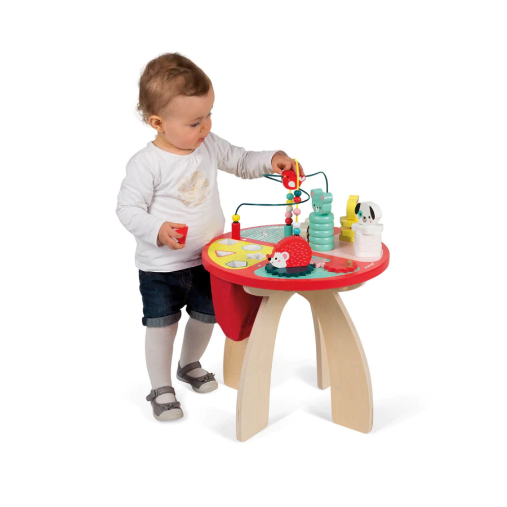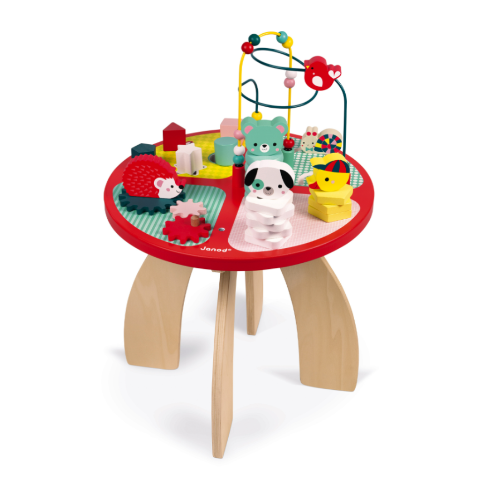 Aktivnosni drveni stolić podijeljen je u 4 dijela, a stiže kao pomoć malim zaigranim ručicama u razvoju raznovrsnih vještina!