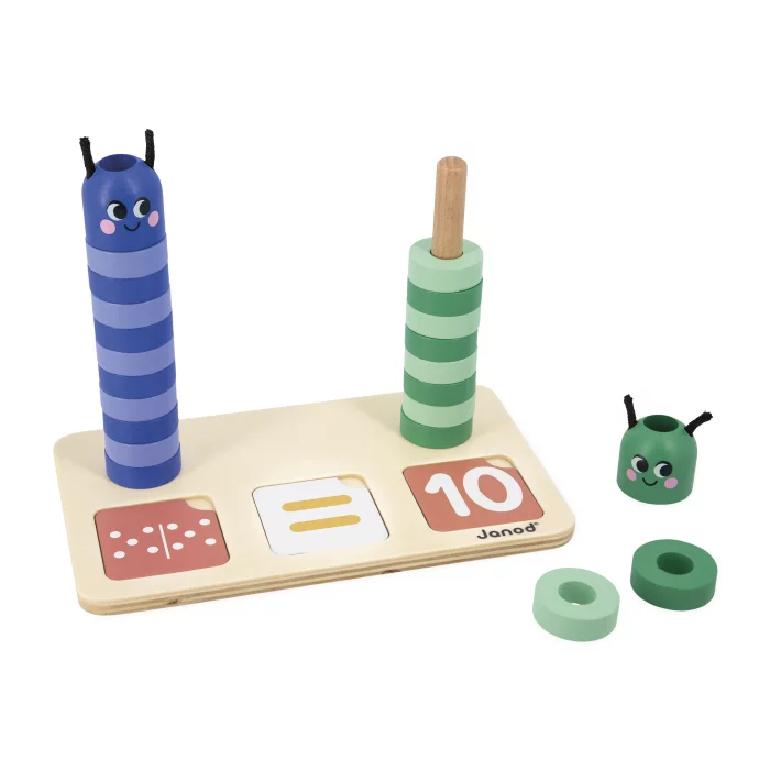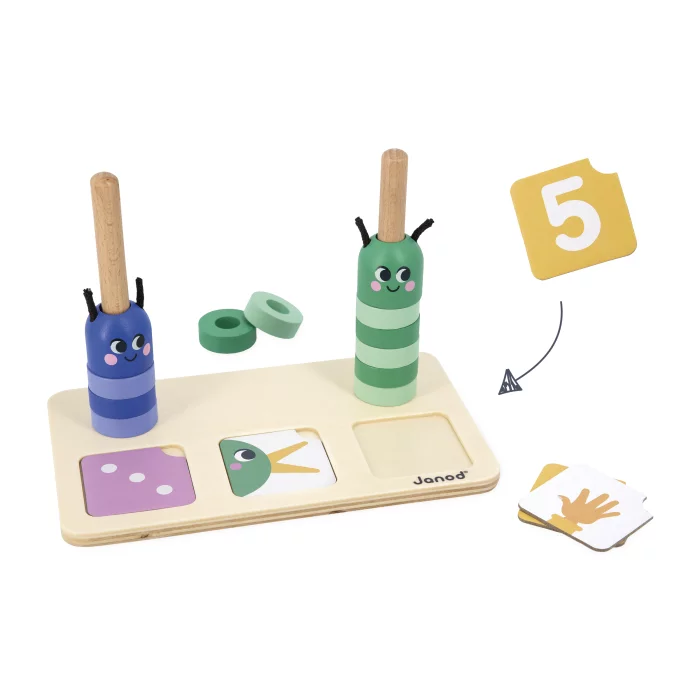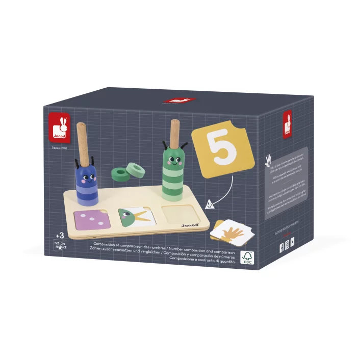 Naučite brojeve i nejednakosti uz ovu zabavnu igru. 2 nestašne gusjenice spremne su pomoći mališanima da nauče brojati i uspoređivati! Ova drvena edukativna igra prikladna je za djecu od 3 godine i više – olakšat će shvaćanje ovog koncepta fizičkim prikazivanjem brojeva. Djeca će morati upotrijebiti perle u boji, formirajući tijelo gusjenice, kako bi reproducirali brojeve naznačene na 33 karte za igru. Brojevi mogu biti prikazani kao znamenke, prsti na ruci ili kockice. Slažući gusjenicu na drveni stalak, vaše dijete će shvatiti koliko dijelova treba dodati ili ukloniti iz tijela gusjenice da dobije zadanu količinu. Nakon što se savlada ovaj prvi korak, bit će vrijeme da se dotaknemo pojma usporedbe, npr. “veće od” i “manje od”, uz pomoć posebnih kartica. Letak s uputama pomoći će vam da maksimalno iskoristite ovu igru. Ova je igra razvijena u suradnji s učiteljima, kako bi se najbolje replicirao proces učenja i napredak postignut na svakoj razini. Izrađen od FSC® drva i kartona.