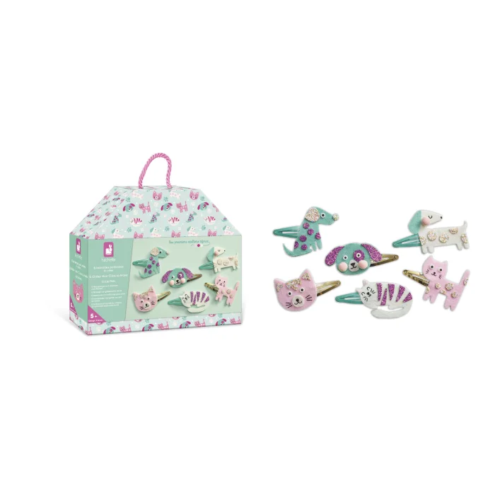 Ovaj kreativni set namijenjen je djeci od 5 godina naviše, a omogućuje im da vlastitim rukama izrade 6 svjetlucavih šnalica – 3 s motivom psića i 3 s motivom mačića.