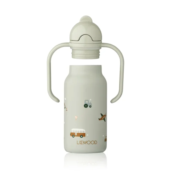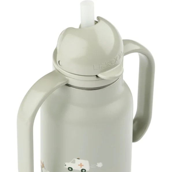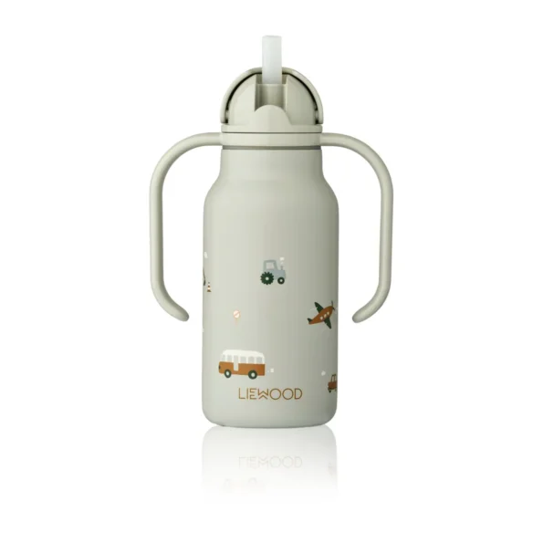 Liewood boca Kimmie 250 ml – Vehicles / Dove blue. Kimmie bočica za vodu ima dvije jednostavne ručke pričvršćene na poklopac, ugrađenu slamku i izrađena je od nehrđajućeg čelika 18/8.