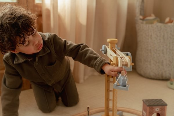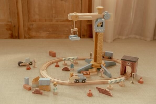 Gradi i kreni! Ova drvena dizalica podiže i sigurno spušta terete. Uključuje građevinski materijal, vozila, građevinske radnike i prometne znakove. Savršeno za malog graditelja i lako se kombinira s XL setom vlakova!