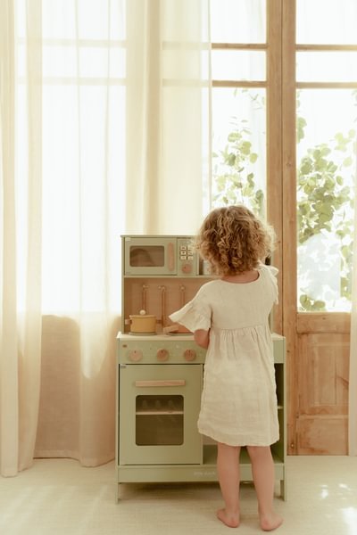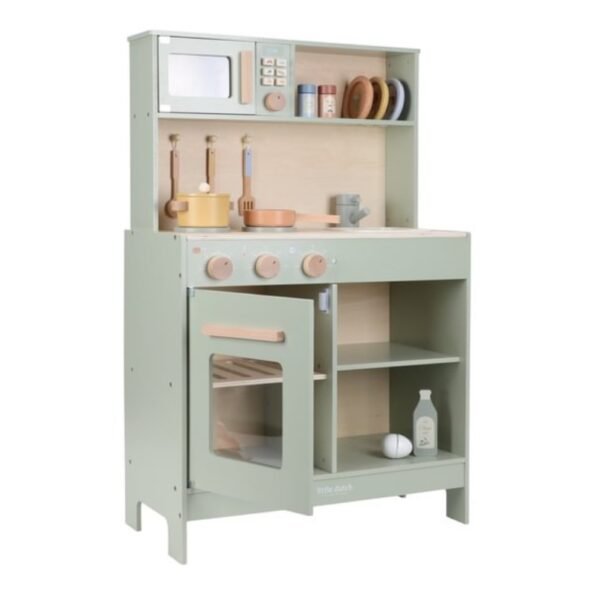 Mali kuhari mogu se baciti na posao u ovoj prekrasnoj drvenoj kuhinji za igru! Ispecite ukusan kolač u pećnici, pripremite svježe povrće na štednjaku ili ispržite jaje u tavi. Kuhinja je potpuno opremljena s dvije tave, priborom za kuhanje, tri tanjura i sudoperom za pranje posuđa i ruku. Također uključuje: bocu maslinovog ulja, set za sol i papar te ormarić za pohranu hrane. Mikrovalna pećnica ima prave gumbe s ilustracijama za dodatnu zabavu u igri. Što se danas kuha?