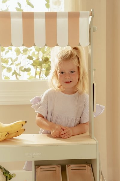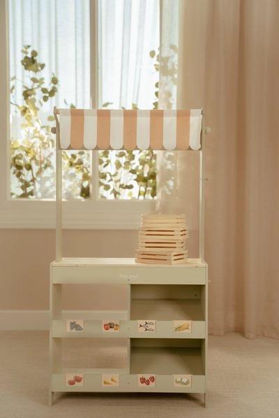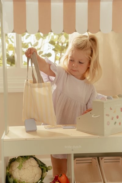 Dobrodošli na tržnicu! S ovim prekrasnim drvenim štandom, djeca se mogu igrati vlastite trgovine. Platnena nadstrešnica daje autentičnu tržnu atmosferu, a uz ploču za pisanje kredom i ilustrirane kartice mogu lijepo izložiti proizvode. Set također uključuje torbu za kupovinu i sanduke za pravo iskustvo kupovine. Okrenite štand i on postaje kafić s jelovnikom i veselim ilustracijama. Kombinirajte s blagajnom, vagom ili višekatnim štandom s pecivom za još više zabave u igri. Što je danas na jelovniku?