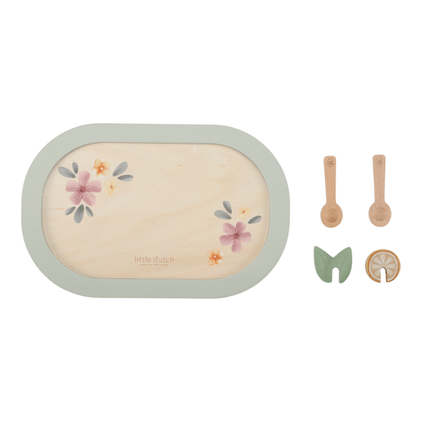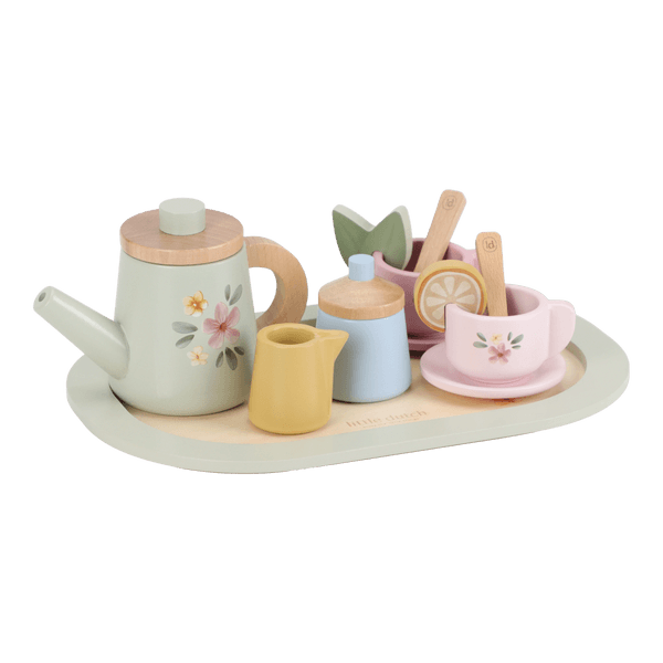 - set sadrži: 1 drveni čajnik s poklopcem, 1 vrč za mlijeko, 1 posuda za šećer s poklopcem, 1 poslužavnik, 2 šalice, 2 tanjura, 2 žličice, 1 kriška limuna, 1 list metvice.
