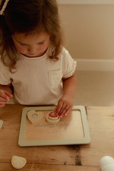 Vrijeme je za pečenje nečeg ukusnog! S ovim drvenim setom za pečenje, mali pekari uče sve o pripremi ukusnih kolačića i peciva. Set uključuje karticu s receptima i sve osnovne stvari, kao što su zdjela za miješanje, lim za pečenje s kolačićima, nadjevima, jajetom, maslacem, brašnom, šećerom, mlijekom, pa čak i šarenim posipom. Razvaljajte tijesto valjkom i ukrasite kolačiće po želji. Savršen set za beskrajnu zabavu u kuhinji za igru!