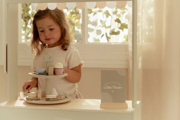 Vrijeme je za čaj! S ovim prekrasnim drvenim stalkom na više razina punim ukusnih peciva, djeca mogu poslužiti najljepši popodnevni čaj. Na tri sloja naći ćete muffin, kekse i šarene makrone – sve jednako primamljivo. Koristite priloženi pribor za posluživanje torte i jelovnik s ilustracijama kako bi gosti mogli birati. Savršeno za maštovitu igru i ugodne trenutke uz čaj!