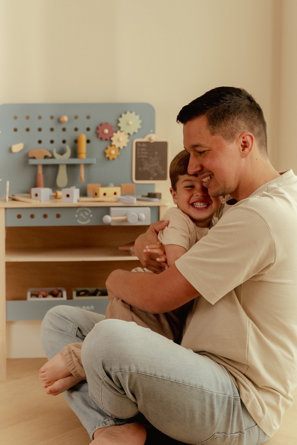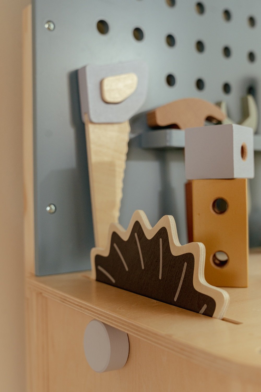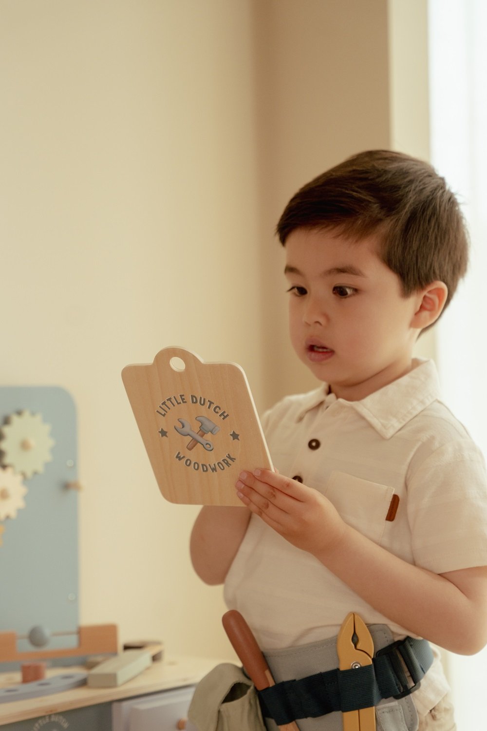 Ovaj čvrsti drveni radni stol Little Dutch dolazi u kompletu s drvenim alatima. Kompletni set sastoji se od 55 dijelova, uključujući čekić za igranje za djecu, ključ, odvijač, matice i vijke.