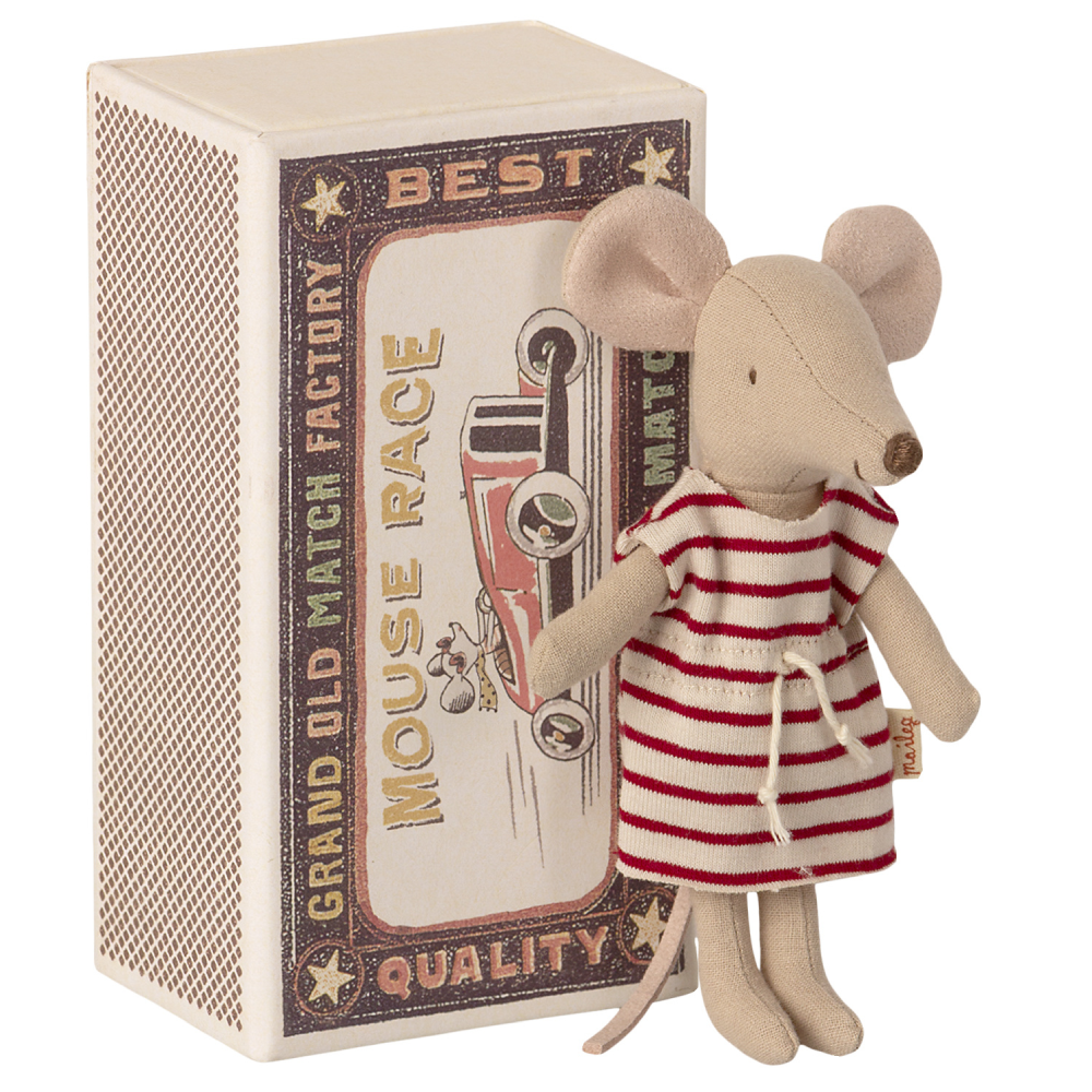 Ovaj Maileg miš spreman je za sate igre i mirno spava u maloj kutiji šibica. Odjeća i posteljina izrađeni su od mekanih tkanina s unikatnim printom u prekrasnim bojama.