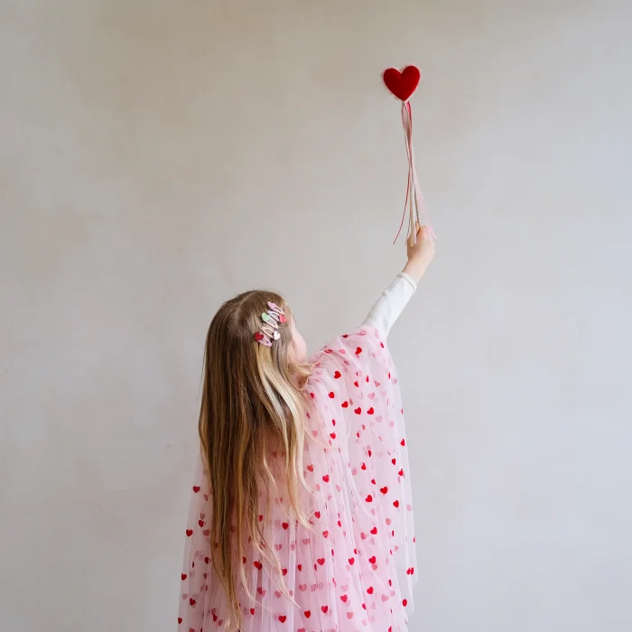 Na vrhu štapića nalazi se mekano baršunasto srce s ružičastim valovitim rubovima, pričvršćeno na štapić omotan zlatnom glitter vrpcom i ukrašeno višebojnim satenskim resicama. Savršen dodatak uz suknju, plašti i torbicu Srce za potpuni čarobni outfit male princeze. Duljina štapića približno 41 cm.