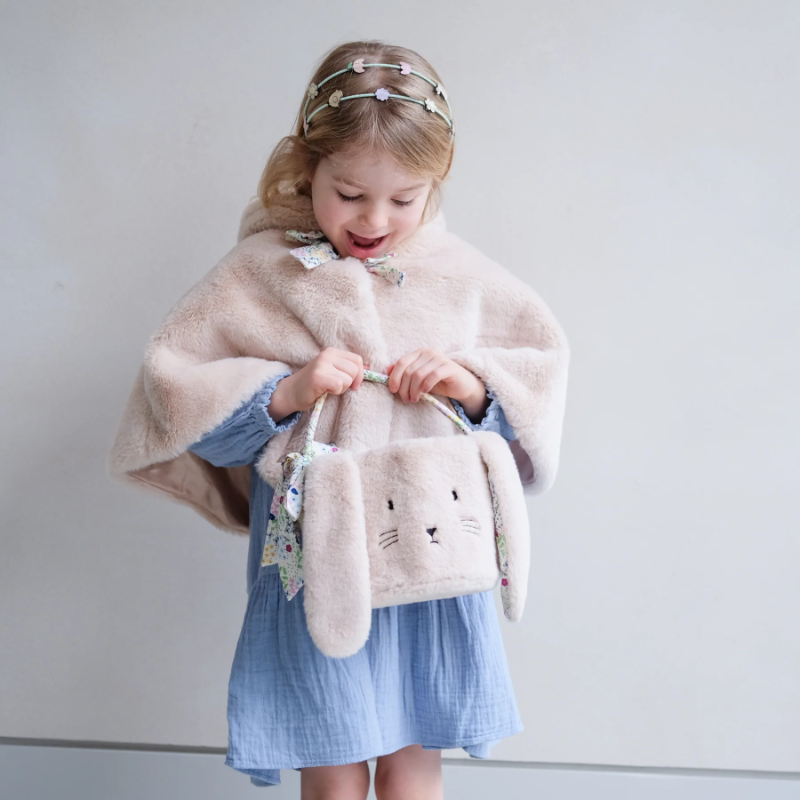Izrađena od najmekšeg krzna s cvjetnom podstavom, floppy ušima, ručkom i ručno vezanom mašnom, ova košarica je savršena za male istraživače. Idealna je za nošenje posvuda, bilo da se radi o uskrsnoj potrazi za jajima ili svakodnevnim avanturama.