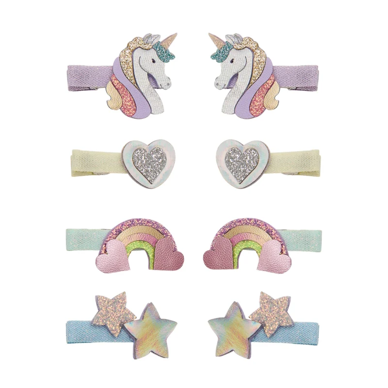 Ove preslatke mini špangice u nježnim pastelnim bojama savršen su dodatak za svaki dan ili posebne prilike. Ukrašene jednorozima, duginim bojama, srcima i zvjezdicama, oduševit će svaku malu ljubiteljicu bajki.