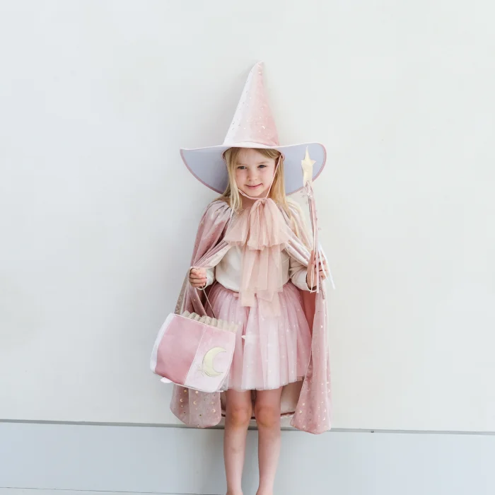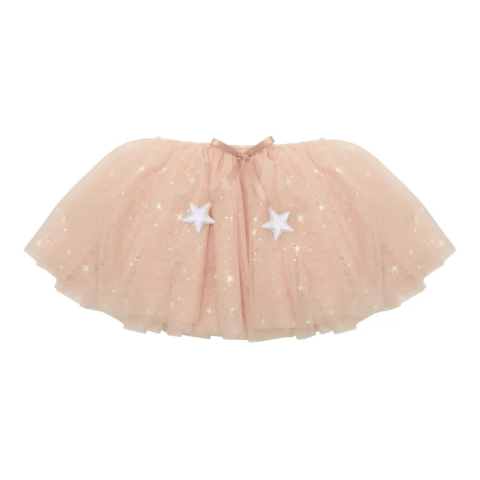 Lagana i pahuljasta, izrađena od slojeva nježnog ružičastog tila posutog sjajnim metalik zvjezdicama, ova suknja unosi dašak bajke u svaki dan. Savršena je za maštovite igre, ples, rođendanske proslave ili maskenbale, a lako se kombinira s plaštom i šeširom Princeza za potpuni vilinski izgled.